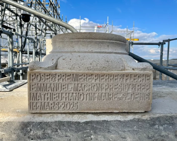 El 14 de marzo de 2025 se colocó la primera piedra de la reconstrucción, que marcará el inicio de un proyecto que durará 5 años. Al acto asistieron el Ministro de Cultura francés, el Presidente del Centro de Monumentos Nacionales, el Obispo de Saint-Denis, el Alcalde de Saint-Denis y Stéphane Bern, mecenas oficial del proyecto.